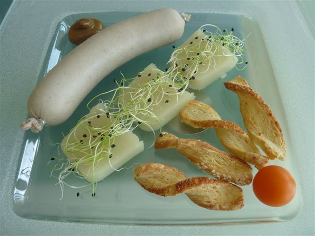 es gab eine Appenzeller Siedwurst, Zwiebelterrine mit Zwiebelsprossen, Blätterteiggebäck