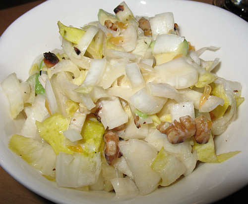 Heute gab es erst einen Chicoree-Salat mit gerösteten Walnüssen, filetierter Mandarine und Avocadowürfeln...