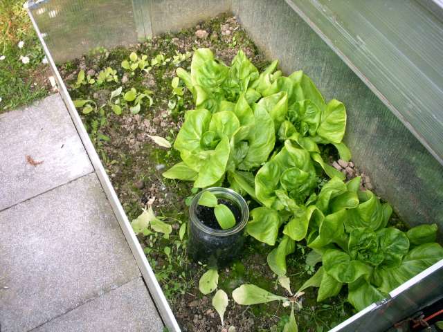 Wir ernten schon seit Wochen laufend Salat. Im Moment sind wir hier an diesem Frühbeetkasten dran.