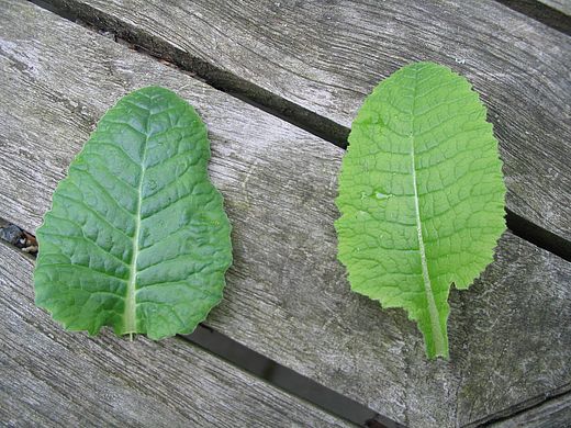 Bei den Blättern ist ebenfalls die "blasigere" Struktur von P. veris zu erkennen.Links: Primula verisRechts: Primula elatior