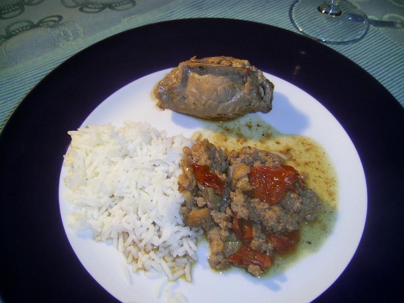 Lecker!Bei uns gab es am Sonntag Kalbsröllchen, die mit einer Füllung aus Rinderhack und getrockneten Steinpilzen gefüllt waren; dazu gab es Basmatireis und ein Sugo aus der restlichen Füllung plus getrockneten Tomaten und etwas Flüssigkeit.