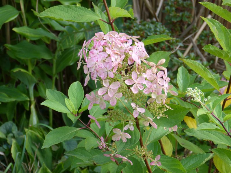 Bei 'Kyushu' wundert mich das etwas. ???Ich kenne sie eigentlich nur reinweiß ohne nennenswerte Herbstfärbung der Blütenstände. Von "weiß" recht schnell zu "braun"... so ist sie hier. Auch die Blütenstände sind mir zu kompakt rundlich und die Einzelblüten zu klein.Meine Hydrangea werden immer farbiger und laufen im Herbstgewand nochmals zu Hochform auf.'Romance'