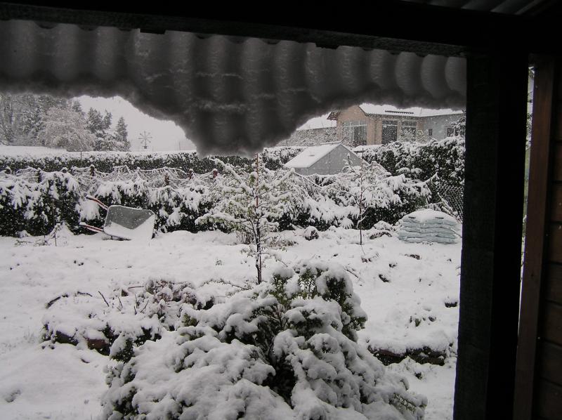 Glücklicherweise bin ich fast immer zu Hause, nicht nur an Ostern, da kann man rechtzeitig eingreifen und auch der auseinander gedrückte Buchs wird von seiner Last befreit, bevor die Zweige brechen... der Rest vom Garten liegt teilweise schon unter Vlies mit Stützstäben darunter....Erdbeeren haben mit dem Blühen angefangen, die Grünspargelsämlinge sind schon 20 - 30 cm hoch - hoffentlich hält die Konstruktion der Last des Schnees stand, denn eine solche Schneelast hatte ich dann doch nicht mit einkalkuliert