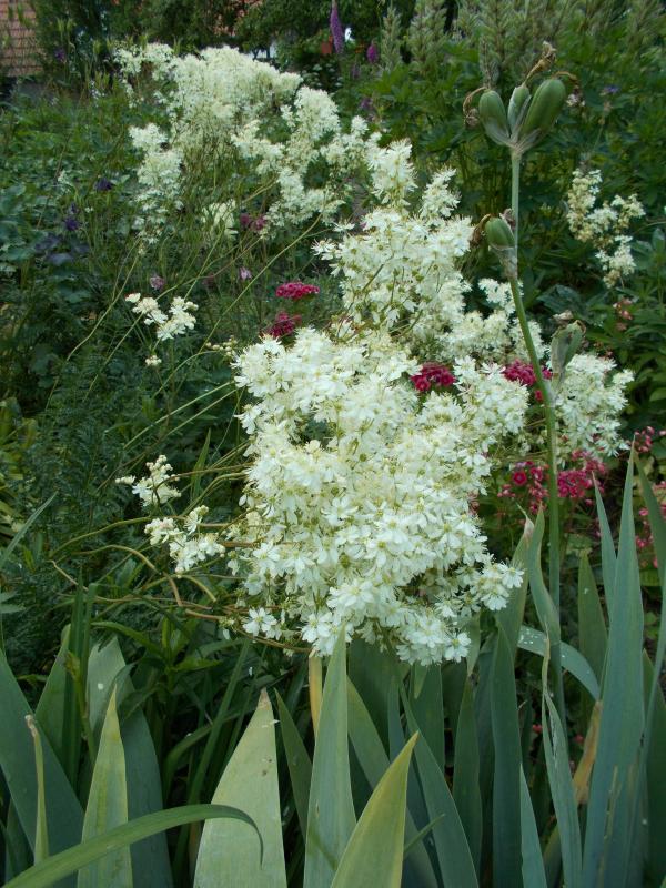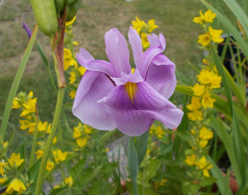 Iris ensata 'Rose Queen' kämpft gegen den wie auch immer in den Kübel gelangten und nicht rechtzeitig entfernten Lysimachia punctata (ich werd' den Kübel dieses Jahr mal neu aufpflanzen müssen, aber die Kombi hat auch irgendwie was ;))