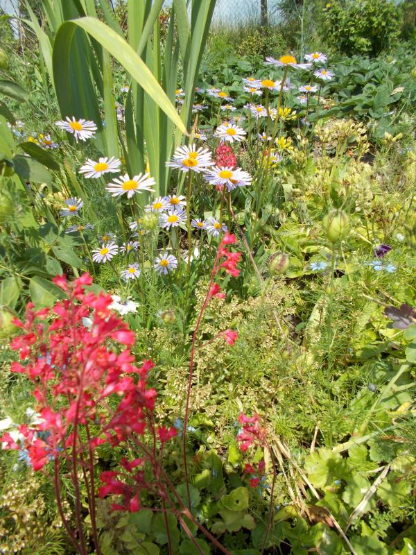 Ein Rückgriff in die Nähe des Beginns dieses Threads: In #22 steht eine Aster bei nana, die enaira in #26 als Aster tongolensis angesprochen hat und die 2016 von mir zu nana gewandert war. So sah einer meiner Bestände am 10.6. hier aus. (Mit Art- oder Sortendiagnosen kann ich nicht dienen – die wohnt hier schon länger als ich, also mindestens seit den Spätsiebzigern. Aber enairas Verdacht könnte durchaus hinkommen.