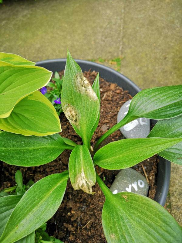Bei mir haben drei Hostas Sonnenbrand: 'Tropical Storm'. Das ist ein Sport von 'Rainforest Sunrise'. Die zweite Hosta mit Sonnenbrand ist: Überraschung: 'Rainforest Sunrise'! Was gibt es denn noch für Sports von 'Rainforest Sunrise'? Achja, 'Pocketful of Sunrise'. Meine dritte Hosta mit Sonnenbrand ist... Ratet mal, kommt Ihr nie drauf! Ja, genau: 'Pocketful of Sunrise' (siehe Bild). Allerdings standen die Töpfe an drei völlig unterschiedlichen Stellen. Die eine hat nur etwas Morgensonne bekommen, die andere nur Nachmittagssonne, und die dritte an einer Stelle, wo ich Sorgen hatte, ob da überhaupt genug Licht hinkommt, aber alle drei haben Sonnenbrand.