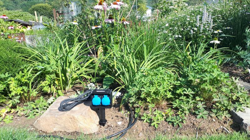 Zum Geburtstag habe ich überraschend eine Gartenbeleuchtung erhalten. Im Zuge der Kabelverlegung kommt nun mein GG auf die Idee, doch gleich 4 Steckdosen im Garten mit zu verteilen. "Nur für den Fall... " Das sieht dann so aus, wie suf dem Foto. Ich bin völlig schockiert. :o Wie bringt man einem Nichtgärtner bloß bei wie viel Zeit man als Gärtnerin allein für die optimale Platzierung dieses Steins gebraucht hat. Ganz zu schweigen von der Pflanzplanung ??? Und daß man nun unter keinen Umständen so ein häßliches knallblaues Ding dulden wird? Ob man nicht zusammen eine weniger auffällige Stelle suchen könnte ? Ich hab's wirklich diplomatisch versucht... ::)