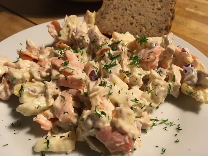 Die Reste des gestrigen Vogels habe ich zu Salat verarbeitet. Mit Apfel, Mandarine, Zwiebel, Karotte, Dille, Zitronensaft, Sauerrahm, Nüsse, S & P