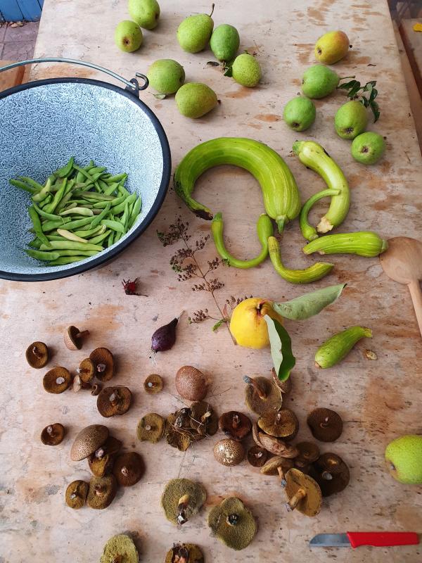 Wir waren heute nochmal im alten Garten. Überraschenderweise hatte die leckere Kringelzucchini noch einige Früchte angesetzt und ich fand einiges an Röhrlingen. Die Bohnen waren zwischen grün und reif und ausgesprochen köstlich zum Abendessen. Die letzten Birnen, etwas Saatgut und 1 rote Zwiebel kamen noch mit. Von meinen drei portugiesischen Birnenquitten hatte irgendjemand zwei geerntet, aber die letzte, einzige, ist dafür perfekt. Schöner Garten, seufz.