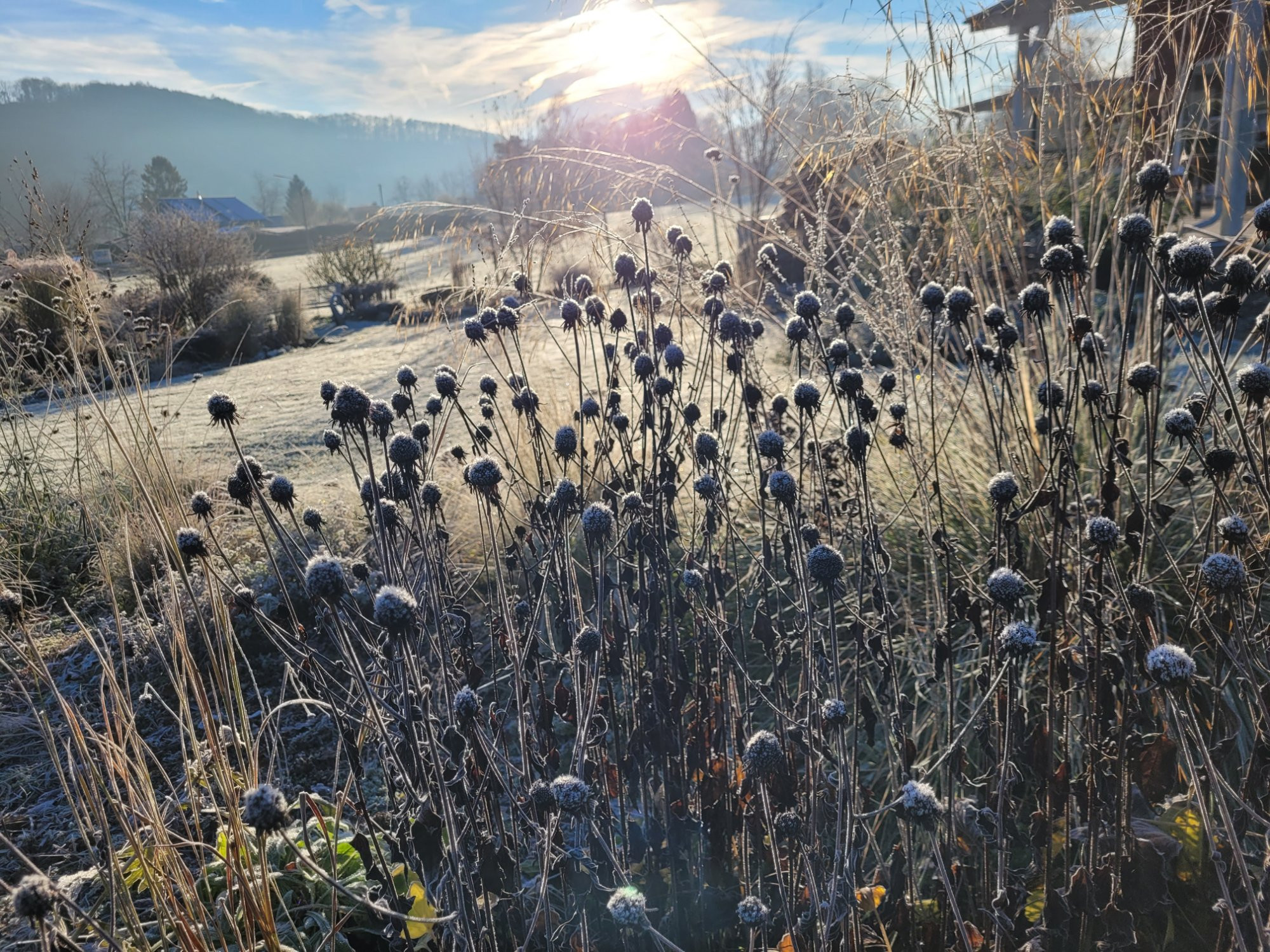 'Goldsturm ' ist mir hier fast zu ausbreitungsfreudig, sowohl mittels seiner Ausläufer als auch durch Versamung. Das nervt mich ziemlich, obwohl ich ihn sehr mag und eigentlich nicht auf diese gelben Sonnen verzichten möchte. Er ist übrigens hier in der Grundrosette fast wintergrün und gibt mit seinen dunklen Knöpfchen durchaus einen schönen Winteraspekt ab. Braucht halt im Beet etwas Platz...