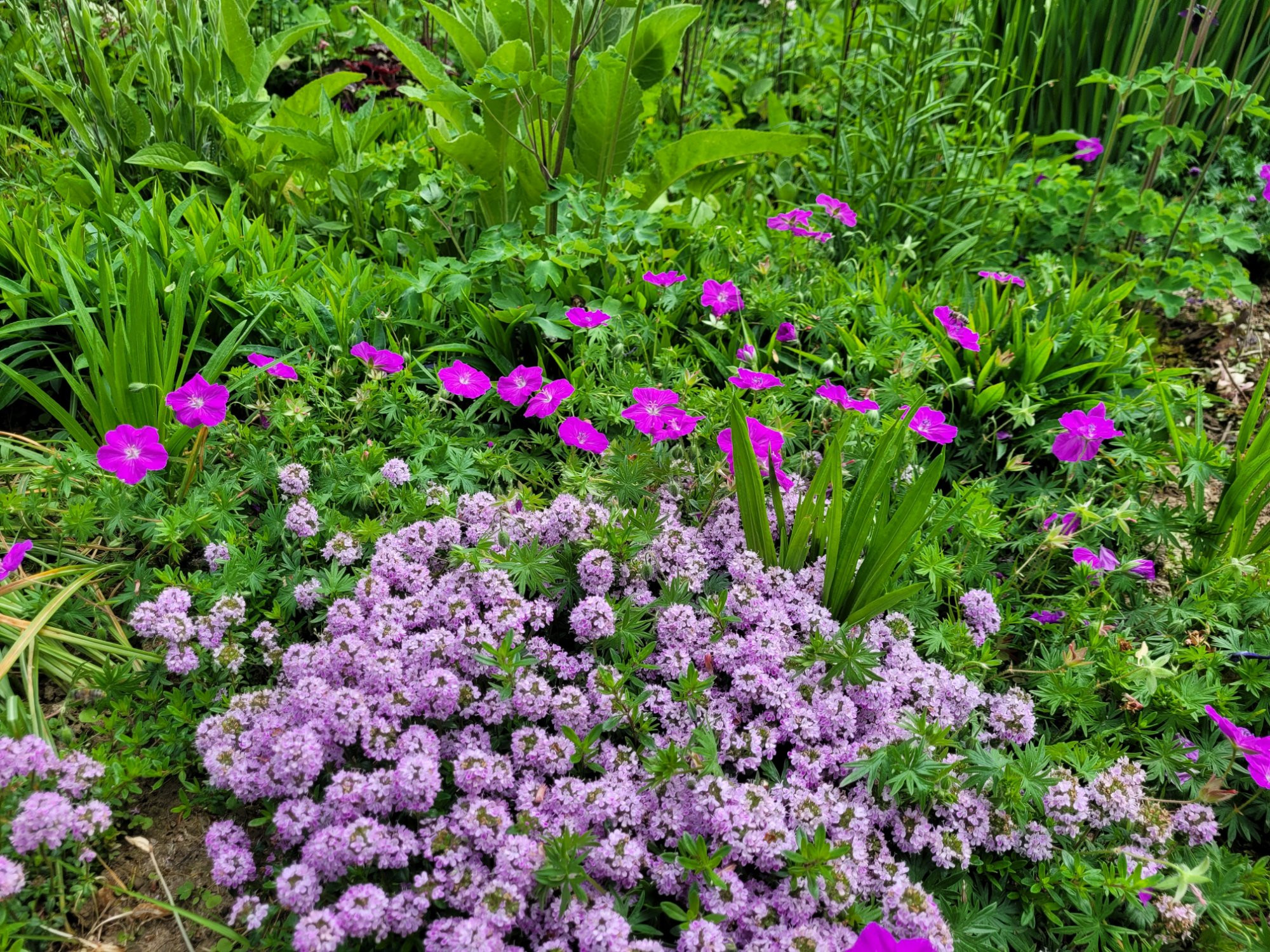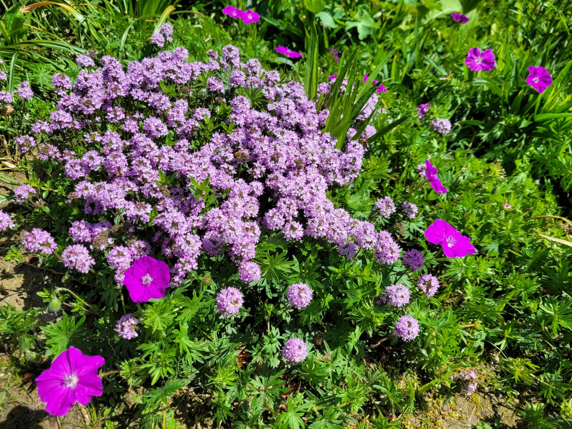 Wenn es doch trockener sein sollte und wenn es Dir auch ums 'locker über die Mauer hängen' geht, könnte ich noch Thymus longicaulis var odoratus beisteuern. Immergrün, üppig "wie Badeschaum" überhängend in Lilarosa blühend... allerdings schon ab Mai. Hier zum Teil durchwoben von Geranium sanguineum, was - finde ich- sehr schön aussieht .