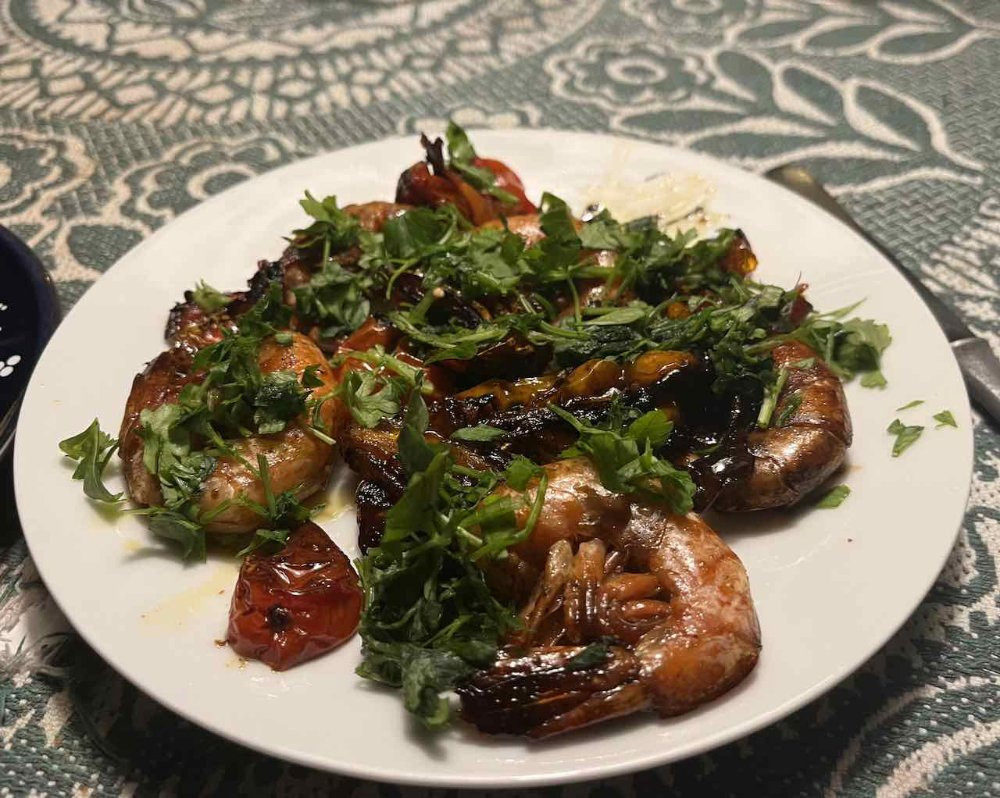 Argentinische Rotgarnelen, asiatisch mariniert und mit gelben und roten Kirschtomaten gebraten und mit Sherry abgelöscht und mit Petersilie bestreut zum Chardonnay 2021 aus Kanada