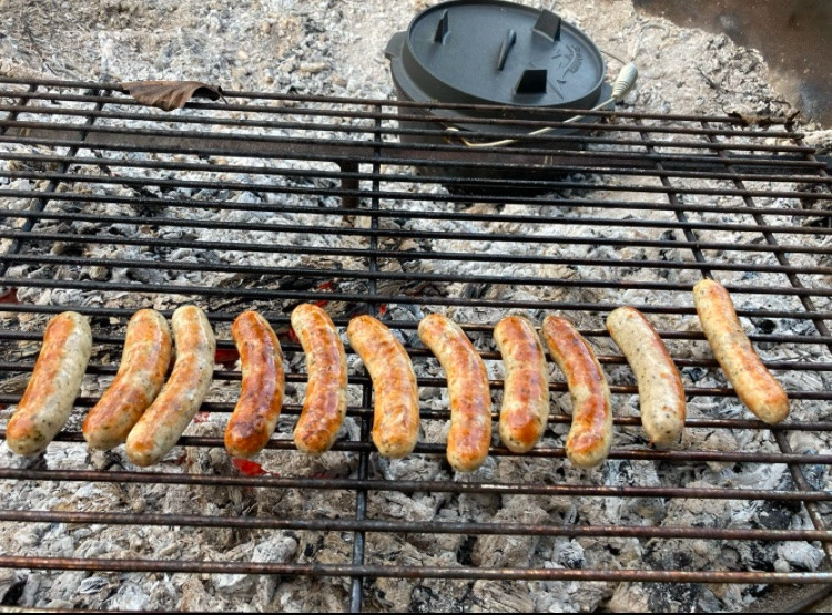 Hier wurde,nach einem 4 stündigen Kettensägenmasaker im Vorgarten, angegrillt. Das klitzekleine Stück Schwein für morgen wurde auch gleich mitgegart.