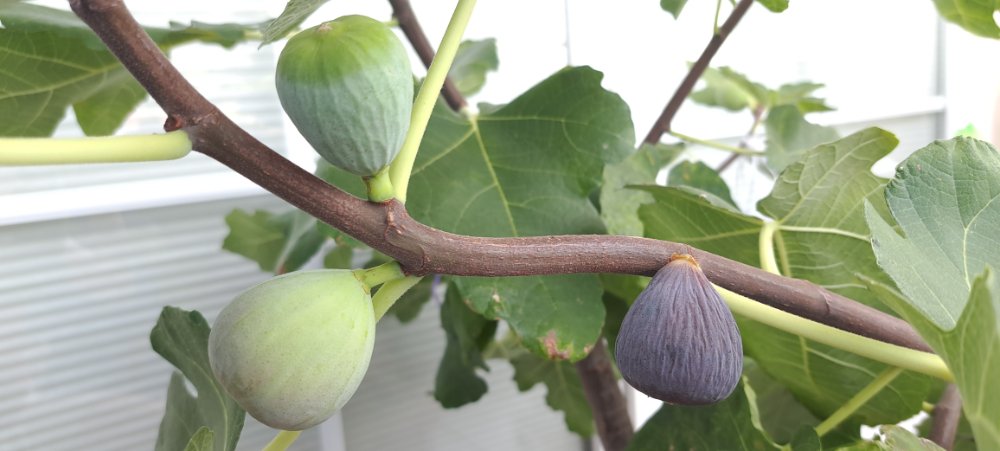 Bei mir reifen jetzt Feigen von Grise de Saint Jean (Topfpflanze, frühgestartet). Hier sieht man am Ast 3 Früchte in jeweils unterschiedlichen Reifestadien: Unreif, Beginn Anschwellphase, Vollreife.
