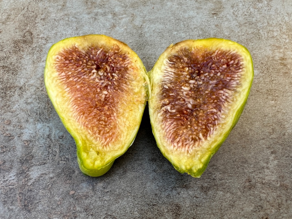 Im Inneren braune Gänge knapp unter der Schale. In der Feige konnte ich keine weißen Larven finden.