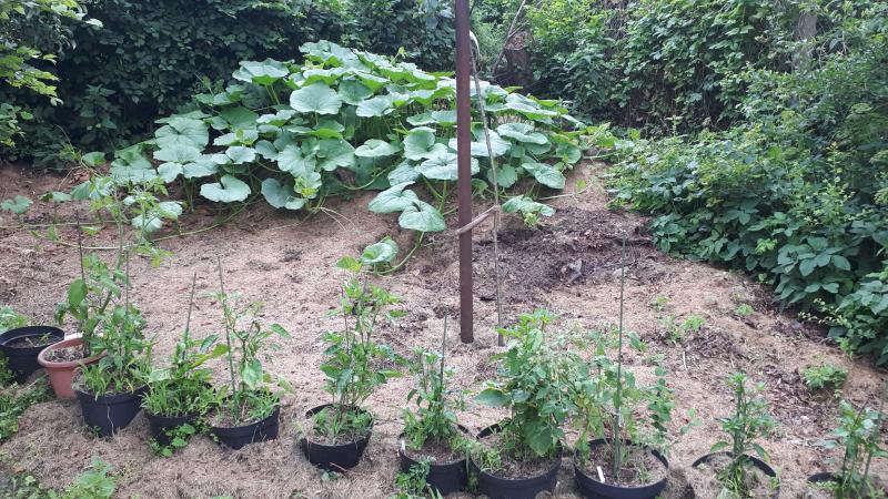 Am Rand der Kürbisecke stehen die Töpfe mit Chilis, weil es dort wirklich viel und lange Sonne gibt. Die wachsen recht langsam, aber es ist schon was dran. Bin unsicher, wieviel Wasser ich geben soll...