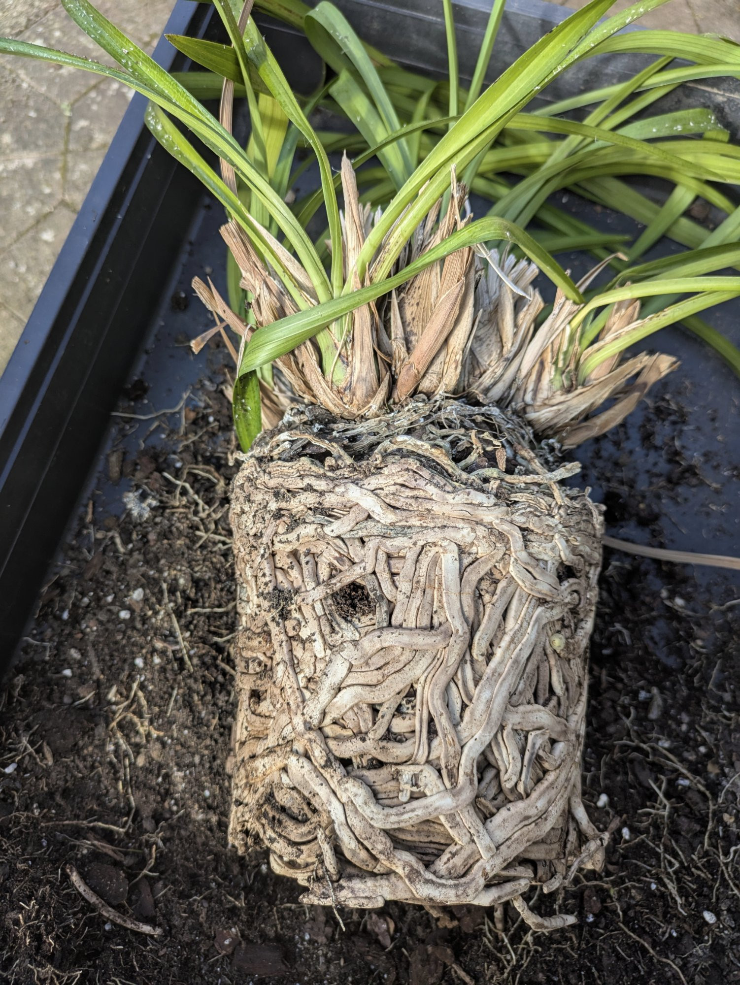 Es passiert oft, dass die ältesten Teilstücke nicht, bzw zögerlich austreiben. Deswegen entferne ich sie beim Teilen/Umtopfen. Siehe es als Verjüngung.