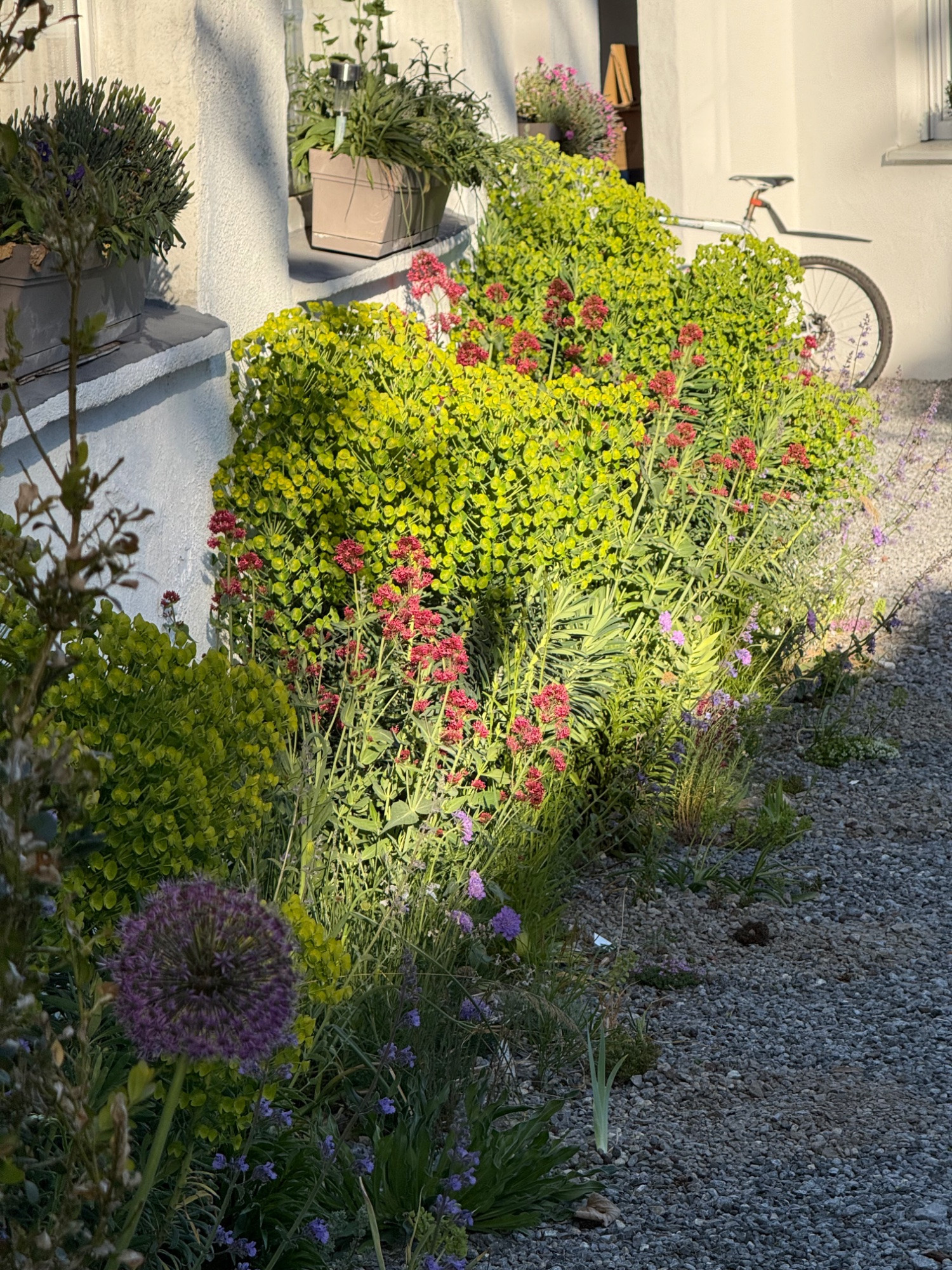Wie man auf dem Bild sieht, habe ich mein Schotterbeet auch von der Einfahrt abgezwackt. Jetzt muss man halt hintereinander statt nebeneinander parken, dafür ist es aber auch ein gewisser Sichtschutz für den Hof und den Hauseingang.