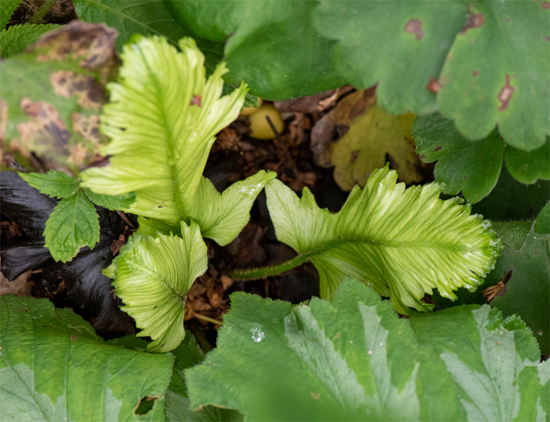 Hier gibt es auch ein eigensinniges Exemplar von Aspl. scol. 'Crispum Boltons'. Im letzten Jahr noch normale Wedel