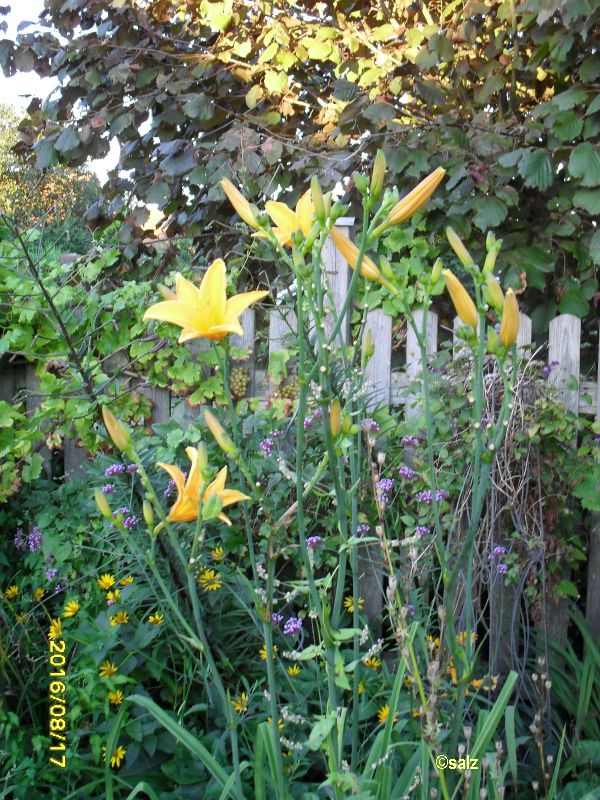 Helene hat geschrieben: ↑6. Aug 2017, 20:57 Augustfreude, Septembergruss und auch die Berleyer Septembersonne sind hier zuverlässig im August blühende Taglilien. Tagebuch führe ich allerdings nicht und ich habe auch nur wenig Fotos aus dieser Phase, da mit abnehmenden Nachtemperaturen die Qualität der Öffnung bei allen Taglilien deutlich nachlässt. Weitere derzeit noch mit Reserve blühende Sorten sind Autumn Prince, Autumn King und die Boitzer Sunny Autumn. Aufgrund der Bildung von weiteren Knospen und der Horstgröße wird vermutlich die Berleyer am längsten durchhalten. Warten wir es ab ;)