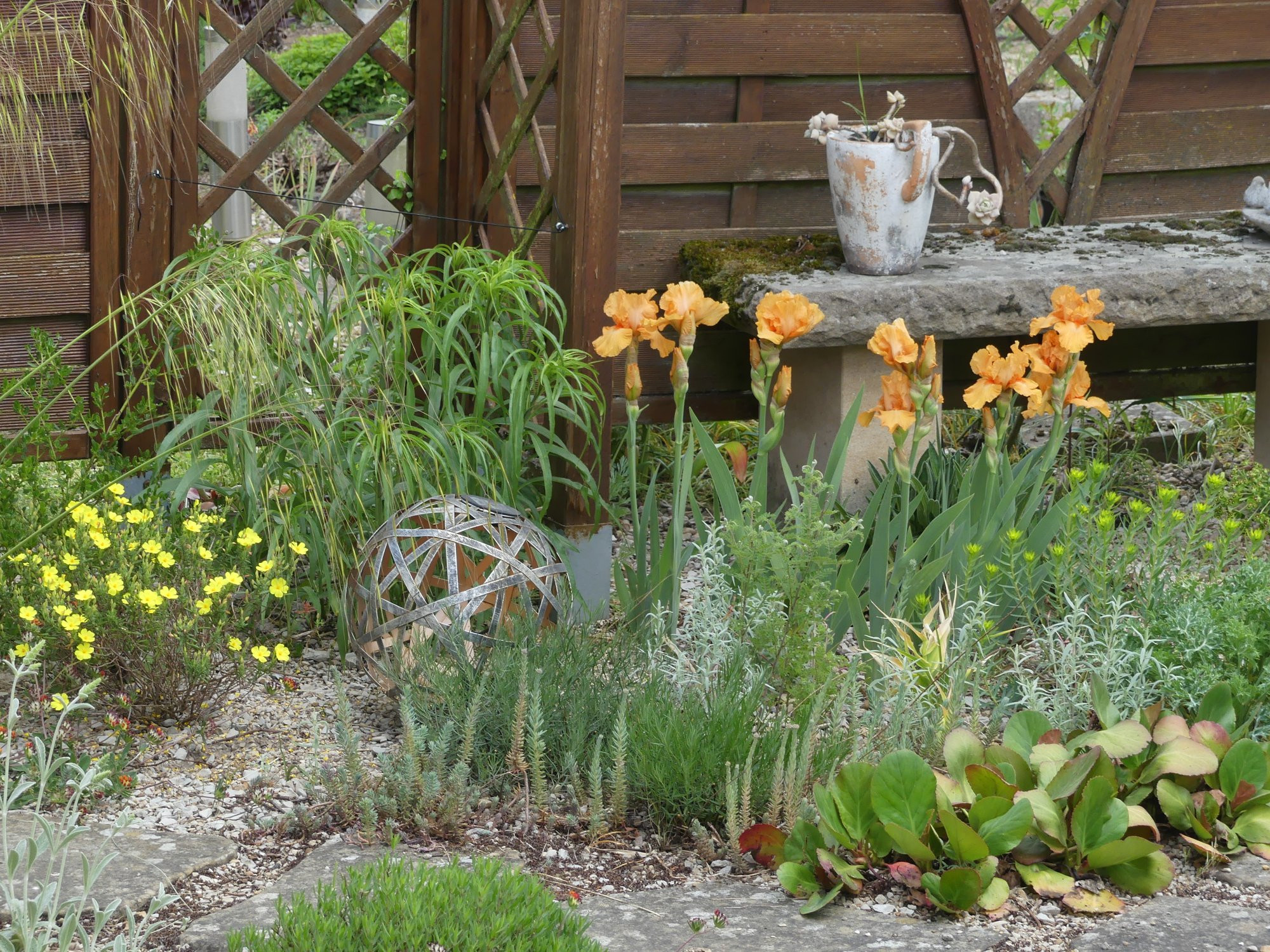 Hier eine Teilansicht meiner Kiesfläche: Es blühen gerade Iris Maid of Orange, Cistus libanotis April Sun und Anthyllis vulneraria ssp. coccinea, bald Euphorbia Abbeydore ( in Knospen), ansonsten gibt es noch Amorpha canescens, Helianthus salicifolius, Ceanothus impressus Victoria, Aster linosyris, Zauschneria Olbrichs Silver, Eryngium bourgatii, Bergenien...