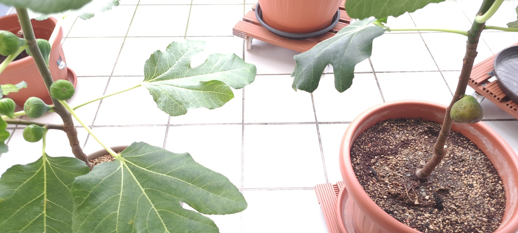 Rechts im Bild eine meiner beiden Ableger von Grise de Saint Jean. Eine erste Breba ist am Ausreifen. Man könnte sie heute bereits ernten, aber ich lass sie noch einen weiteren Tag am Baum hängen. Links im Bild: Black Madeira mit bereits angesetzten Herbstfeigen. Beide Feigen wurden frühgestartet. Standen bis jetzt viel drinnen, sonst wären sie noch nicht so weit.