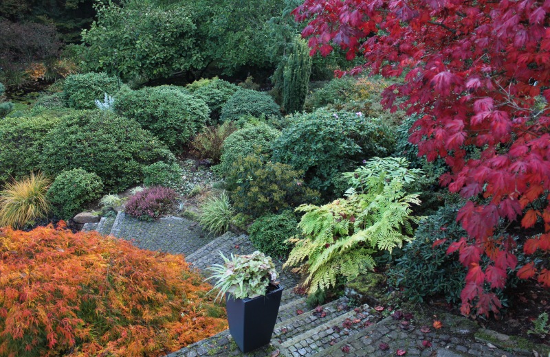 Rechts (rot): Acer japonicum 'Aconitifolium'; links (orange) ein schlichter Acer palmatum 'Dissectum'