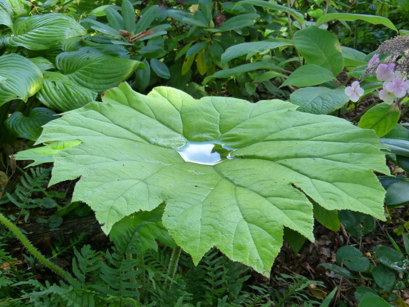 Von den Tafelblättern hat dieses Jahr nur eins, weit hinten im Beet, geblüht. Aber sie sind dank des feuchteren Sommers dieses Jahr überhaupt noch sehr ansehnlich. In anderen Jahren sah das Laub um diese Zeit schon recht unschön aus. Suppenteller gefällig?