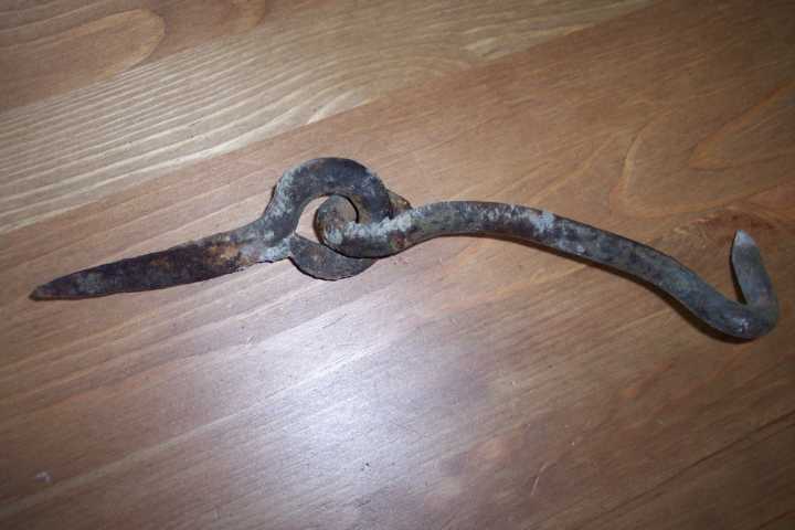 Hallo,das ist ein Haken zum Verschließen von irgendetwas Hölzernem. Vielleicht eine Schuppentür, vielleicht auch von einem Handwagen, Fensterladen oder etwas ähnlichem. Dazu gehört noch eine Öse für die Gegenseite.Viele GrüßePeter