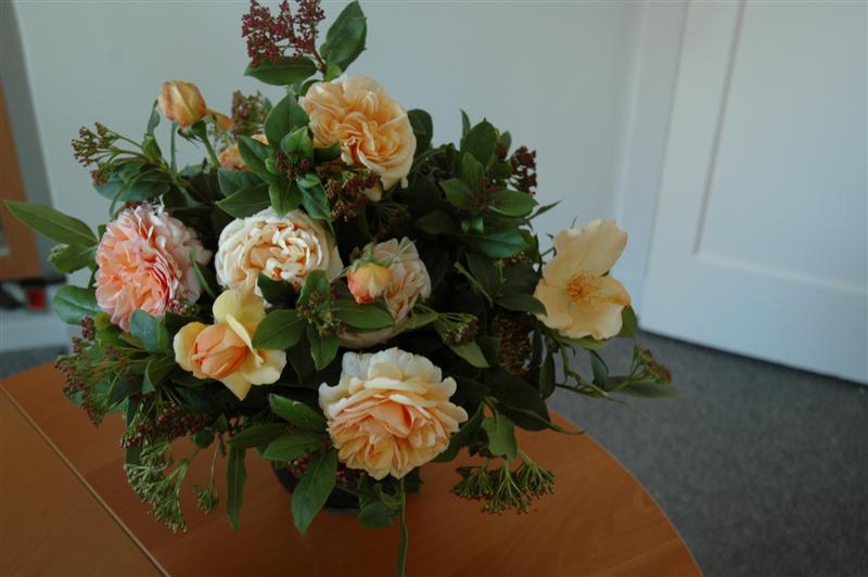 So, gerade habe ich eine schönen Rosenstrauss , verschiedener abricotblühenden aus dem eigenen Garten , als Belohnung für frühmorgendliche Gartenarbeit in's Büro gestellt. Das ist der Zauber des Spätsommers