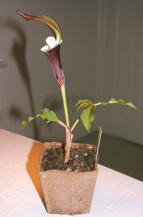 :DEben komme ich nach Berlin in meine Wohnung und rase natürlich als erstes zu alen Fensterbänken, um zu sehen, wie meine Sämlinge in der umschichtigen Obhut von Verwandten und Bekannten überlebt habe.Und was sehe ich da und reibe und reibe mir die Augen?Eine blühende Arisaema sikokianum. Hab noch schnell ein paar Blitzlichtfotos gemacht. Morgen kommen ber nochmal welche bei ectem Licht.Und die zweite Knolle treibt jetzt ebenfalls. Da hat sich doch das nochmal in anderes Substrat Umsetzen nach Norberts Anleitung gelohnt.