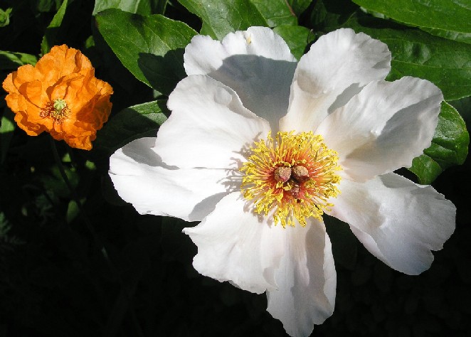 .Hier ist Paeonia ´Garden Peace´ in der Vorpfingstsonne, begleitet von dem vorwitzigen Papaver rupifragum, der hier und da kurzlebige orangefarbene Lichter anzündet.vorpfingstliche und für sonnenschein mitfühlende Grüße Birgit
