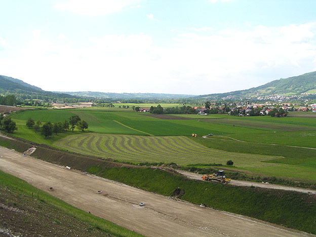 Und hier öffnet sich das Tal nach Norden. Im Vordergrund die Autobahnbaustelle, auf dass unser Nachbarort Kirchdorf nicht mehr bloß wegen der täglichen Stau's bekannt sein wird