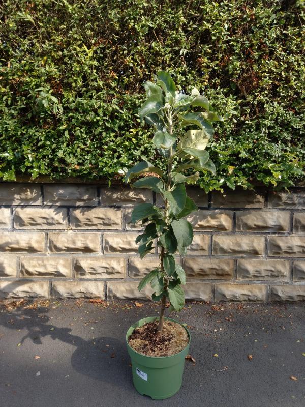 Hier ein Bild vom gekauften Apfel. 90 cm hoch ohne 10 Liter Topf für 10 Euro. Auch hier konnte man jetzt nicht viel falsch machen.