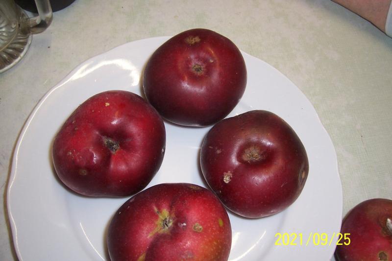 Vor ca. 8 Tagen habe ich meinen unbekannten dunkelroten Säulenapfel geerntet weil er fast allein abfiel. Es war ein halber Eimer voll, leider faulen sie sehr schnell. Sie sind genußreif, zartes Fruchtfleisch mit einem Hauch Beerenaroma.