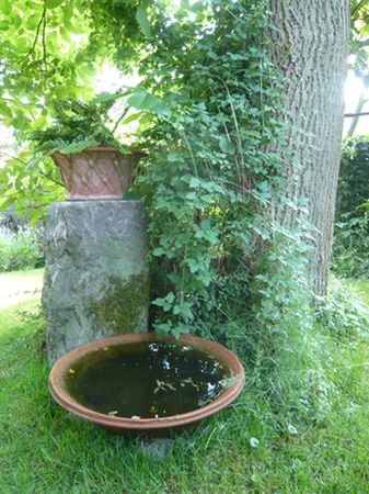 fars, hast du die clematis in einen unten offenen topf gepflanzt, oder ist das eine vogeltränke ?Hier ist die "andere" Seite des Nussbaums, in den sich eine Clematis rankt.