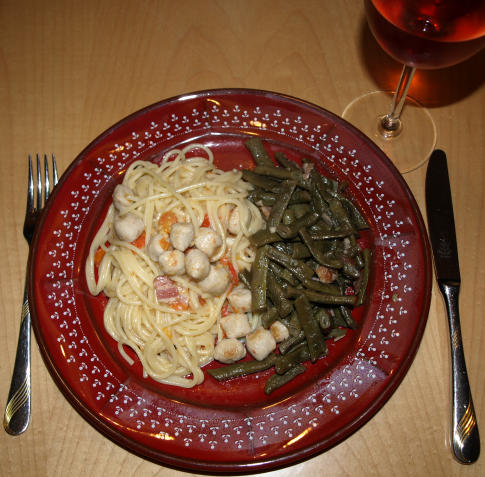 Spaghetti mit Speck-Knoblauch-Brätkügeli-Tomaten-Rahm-Sauceund Bohnen Blauhildedie Blauhilde ist schon eine super feine Bohne, ich bin total Fan von der