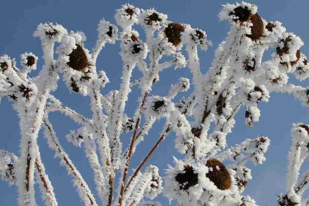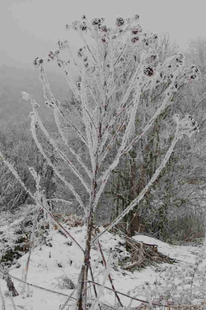 Heute kam seit mehreren Tagen zum erstenmal die Sonne wieder zum VorscheinSolch dicken Raureif hab ich noch nie gesehen.Diese Sonnenblume ist ca 3m hoch!