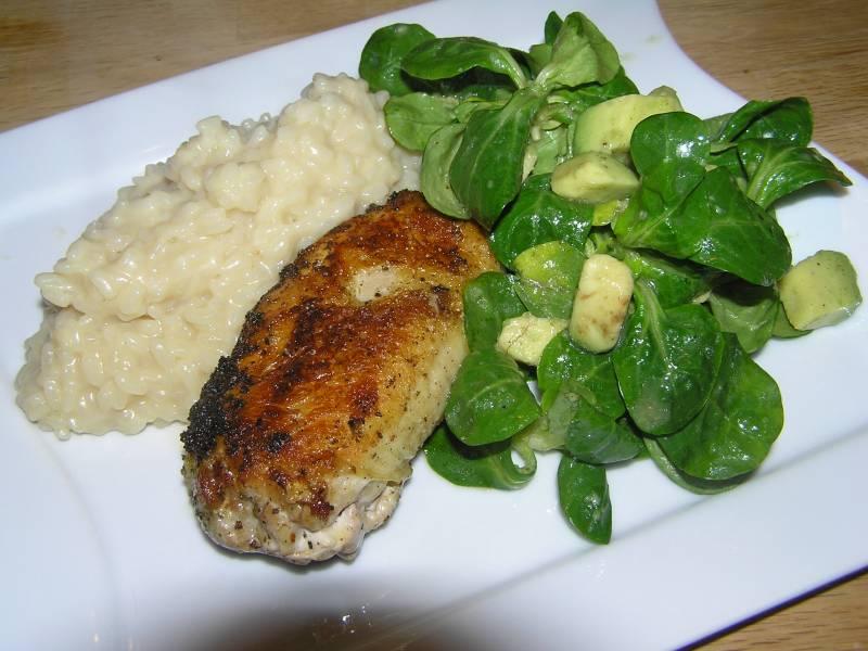 maishähnchensteak mit trüffelrisotto und feldsalat mit avocado.