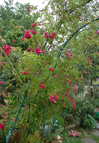 Jein! Täubchen.Ich habe sie, oder auch nicht.Es müssen offenbar mehr als eine unterwegs sein.Meine, ich erhielt sie ganz klein als Geschenk von einem lieben Purler, ist riesig geworden und blüht dauernd und bis zum Frost. Sie neigt zu Mehltau, der Blick wird aber abgelenkt durch die vielen Blüten. Der Mehltau ist am Stiel und Fruchtknoten der Blüten.MHGCSo wie auf diesem Foto, oder guck Dir meine Bilder im HMF an, da stimmt die Farbe in etwa. Eher rötlich mit bläulich. Eine kräftige Farbe. Und ist nicht runtergefroren. Hab allerdings auch keinen Kontrollschnitt gemacht.Hier siehst Du 2 m von ihr, sie ist gegen 3,5 m, das Bild ist vom 17.9.11.Weiß jemand näheres zu Marie Henriette Gräfin Chotek ?Bei hmf steht 1 x blühend, bei Kalb** blüht unermüdlich bis zum Frost.Falls sie jemand hat : wie ist die Blütenfarbe ? Pinkig oder mittel- dunkleres rot ?