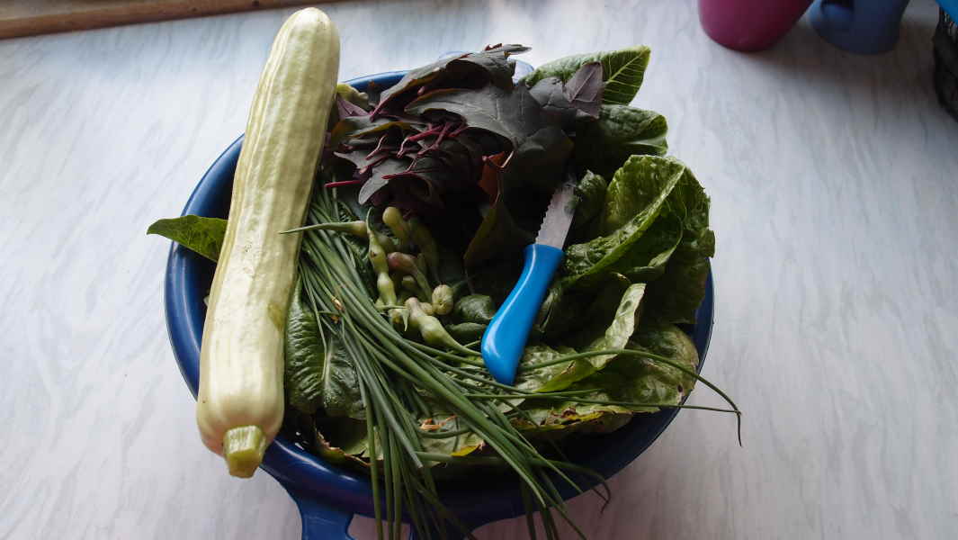 ich hab heute den letzten geschossenen römersalat geerntet. dazu rote melde, schnittlauch, rattenschwanzrettich und die erste zucchini