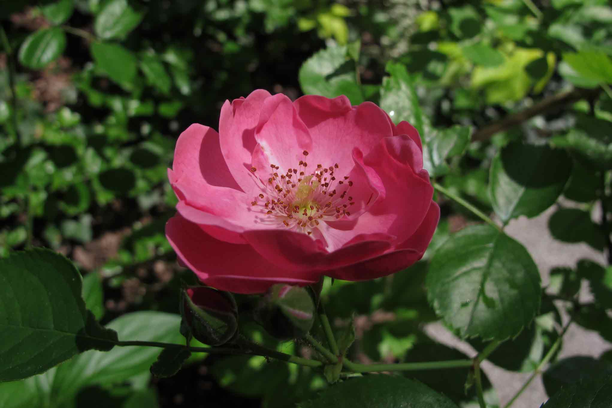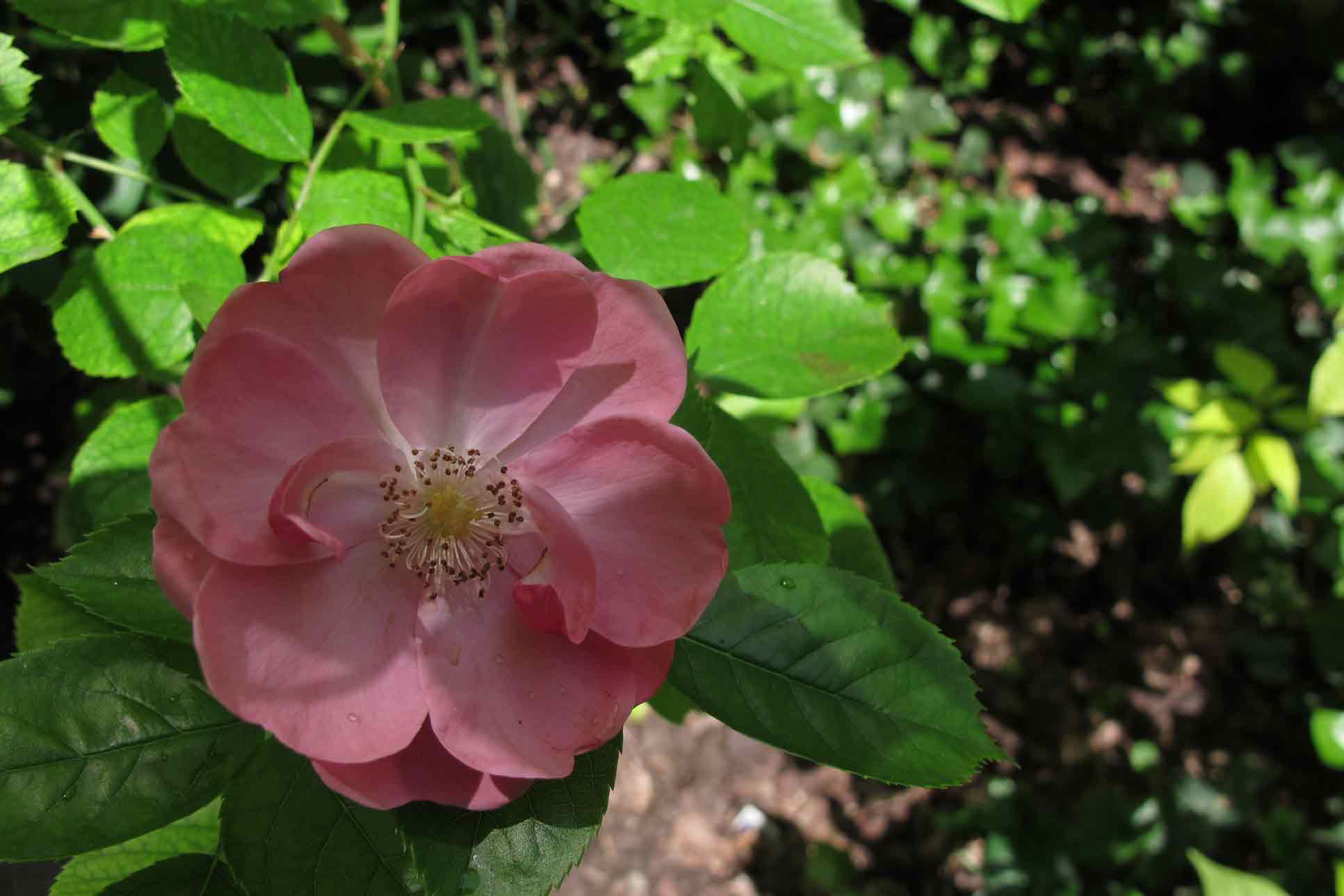 Von den alten Nachbarn, die ursprünglich unseren Hof begrünt hatten, stammt diese Kletterrose, die als großer Strauch mit starken Trieben unbeirrt durch das Dickicht blüht und fein nach Wildrose duftet.