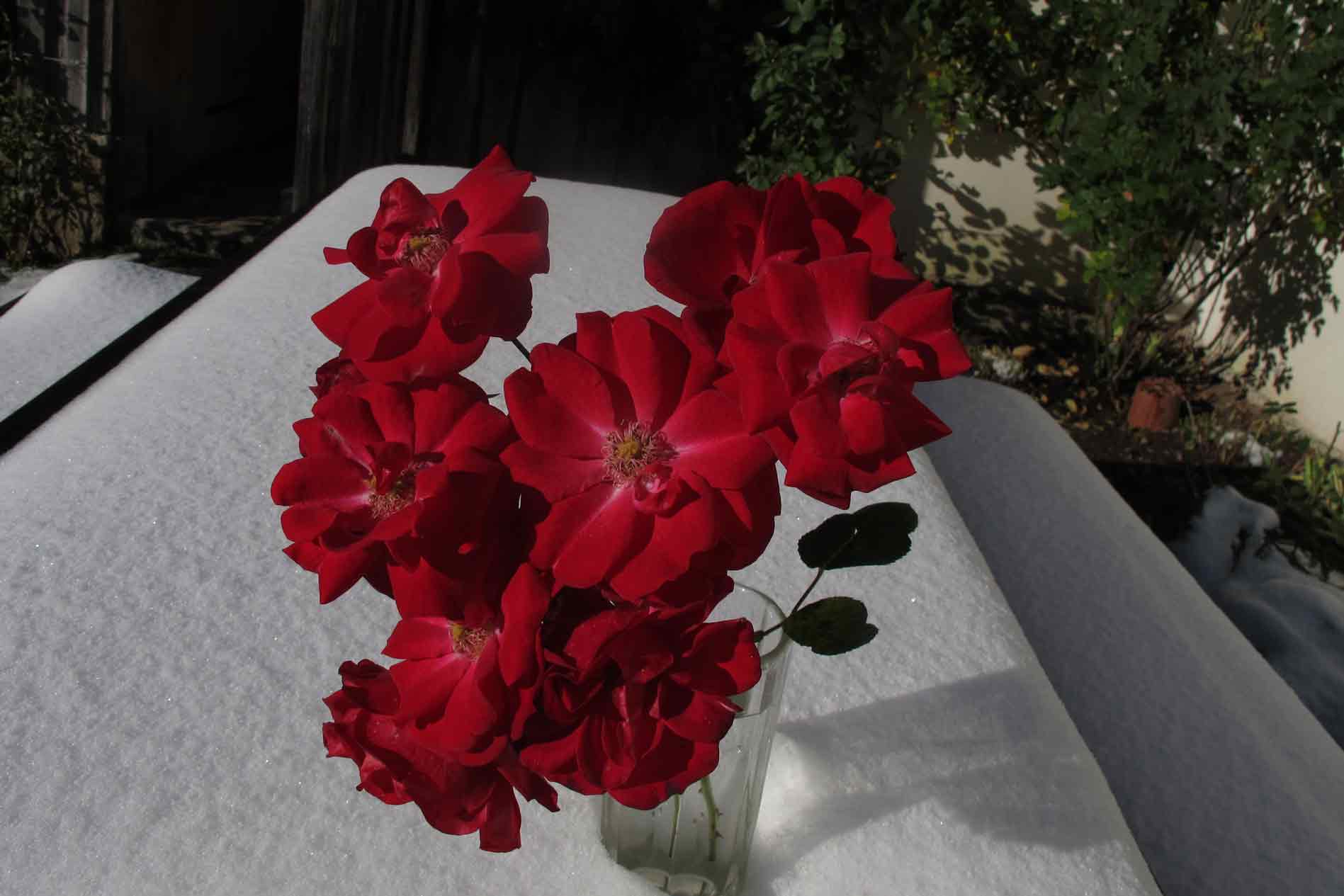 Ah, eine von Tantau, 1956.Dieses Blütenbüschel vom Dirigenten hab ich noch schnell am 26. Oktober abgeschnitten, bevor der Schnee mit -7°C daherkam. Stand dann noch eine Woche fast unverändert in der Vase und wollte doch festgehalten werden[size=0]Arg verspätet, hatte die Kamera nicht hier. [/size]