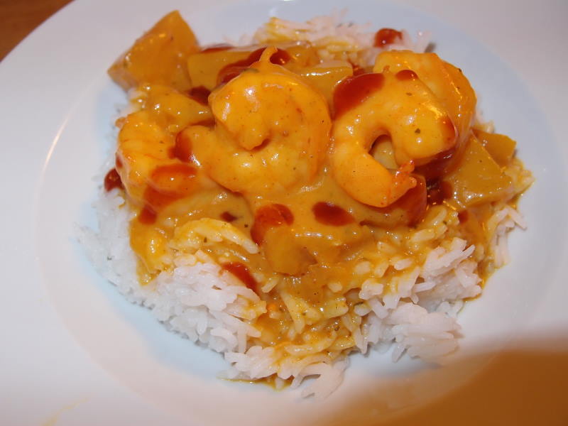 gestern ananas-garnelencurry mit reis und extra scharfe soße oben drüber
