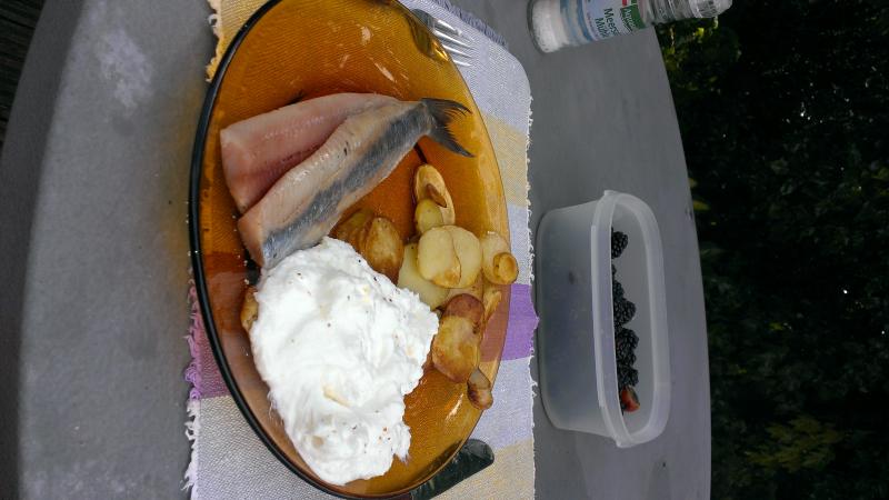Gerade gegessen: Matjes, ganz frische Kartoffeln und gewürzter Schafsmilchjoghurt. Handy spinnt