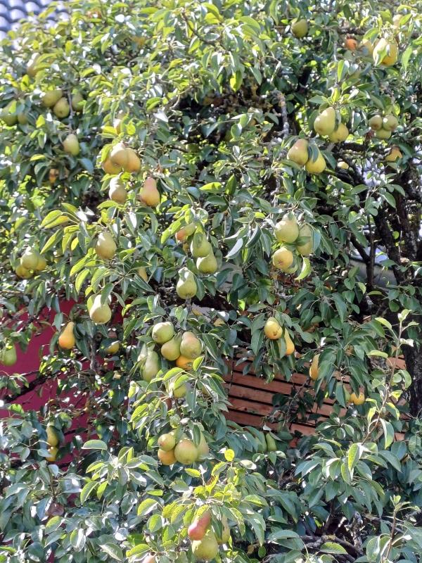 Was mich momentan wirklich sehr erfreut, sind die Sommerbirnen. Der uralte Baum (Sorte unbekannt) hängt voll wie noch nie in den letzten 23 Jahren. Die Ernte funktioniert nach dem Prinzip "was von selber runterfällt, ist reif" :D.