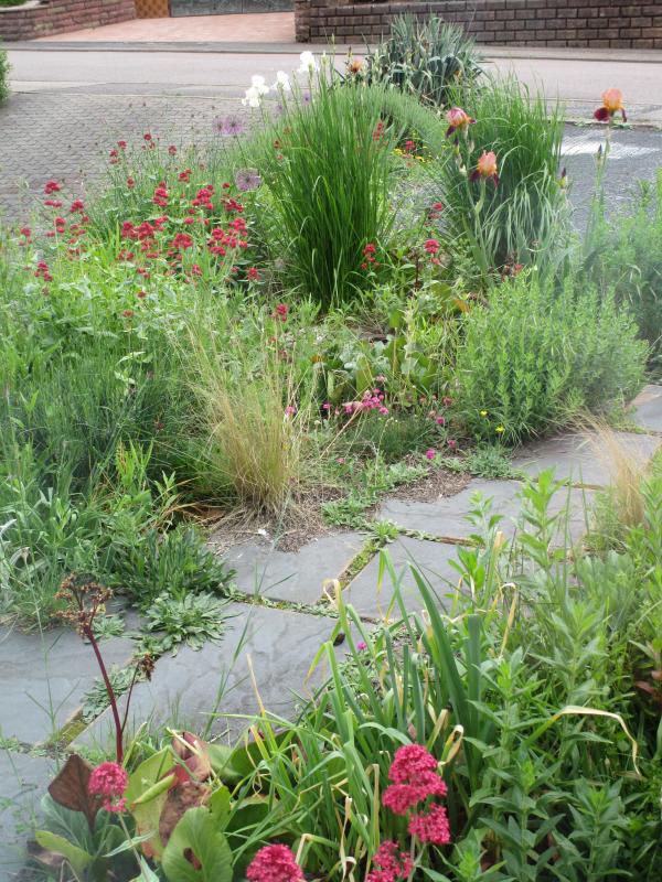 Das rosarote ist Centranthus ruber, der Spornbaldrian. Eine tolle Pflanze, mehrjährig und durch Aussaat verbeitend, ohne lästig zu werden. Weiter hinten im gleichen Bild ist auch Centranthus. Wir wohnen diesen Sommer im siebten Jahr hier, der Vorgarten ist also sechs Jahre alt. Der PKW-Stellplatz und die Platten/Splittfläche sowie die Betonsteinmauern sind aber erst zwei Jahre alt.