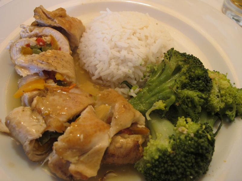 Hier gab es gerollte, mit Senf bestrichene und mit Karotte, Essiggurkerl, rotem Papika und Ingwer gefüllte Putenschnitzel in einer Sauce aus Weißwein, Hühnersuppe und Butter, dazu Brokkoli und Basmati. Man war zufrieden.