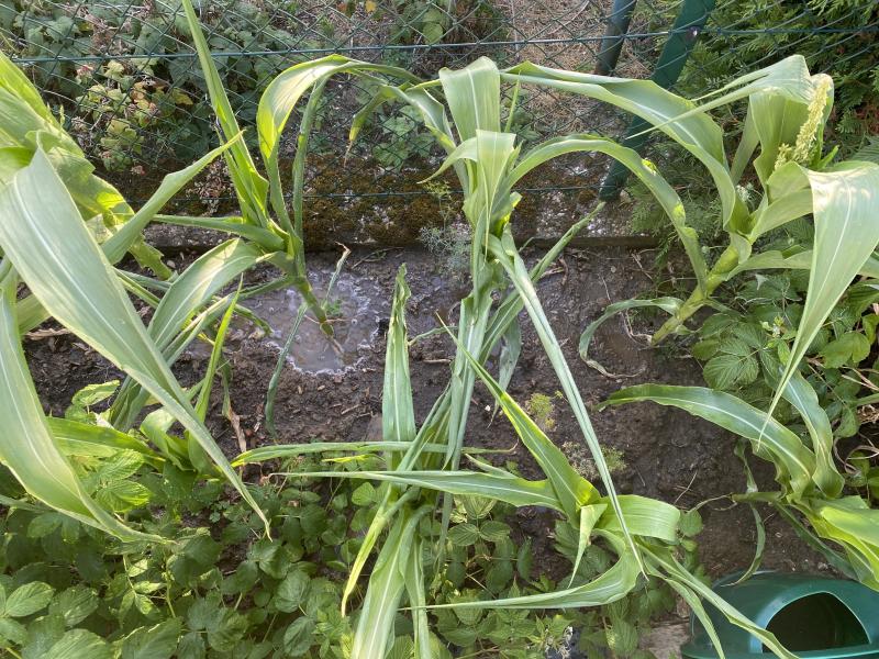 Im Hausgarten kann ich Mais eh vergessen ohne giessen. Mais wurzelt bis zu 2,5 Meter tief, bei tiefgründigem Boden schafft man es lange ohne Bewässerung, bis dann eben Schluss ist. Wir haben 30cm, er rollt seit Anfang Juni ab Mittag die Blätter und kriegt deshalb Wasser.