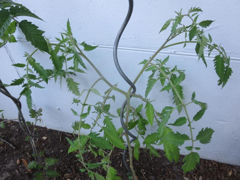 Wenn eine Tomatepflanze sich gabelt und zwei gleich starke Triebe weiter wachsen, dann weiß ich immer nicht, welchen ich weiter an der Stange befestigen soll, z.B. auf dem Foto unten. Und was mache ich mit dem anderen?